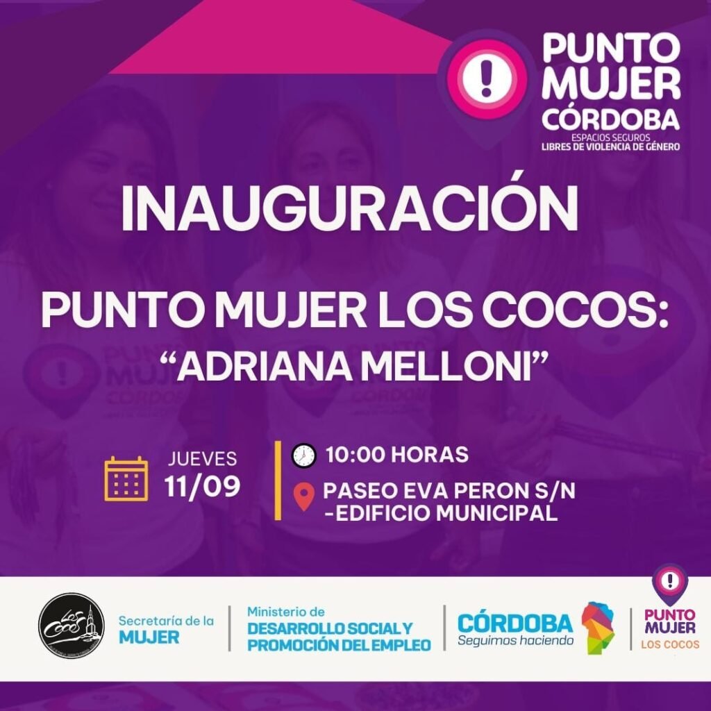Desde la Municipalidad de Los Cocos, Sria. de la mujer de la Provincia y Punto Mujer local, queremos invitarte con mucha alegría a la inauguración del Punto Mujer de *Los Cocos: Adriana Melloni* Fecha:  Jueves 11 de septiembre  Hora:  10:00 hs  Lugar:  Paseo Eva Perón s/n – Edificio municipal. ¡Nos encantaría contar con tu presencia