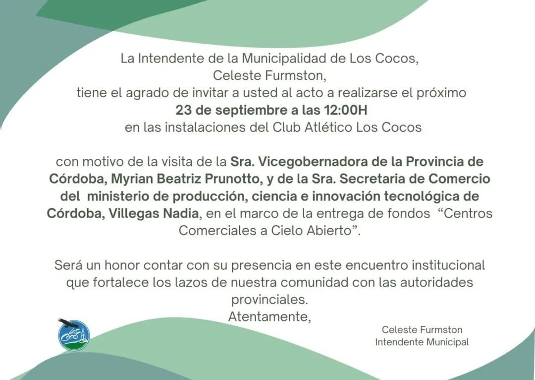 Estimados vecinos, el próximo martes les invitamos al Acto de Entrega de fondos del Programa Centros Comerciales a cielo abierto que se llevará a cabo en las instalaciones del Club Los Cocos, y contará con la presencia de la Sra. Vicegobernadora.