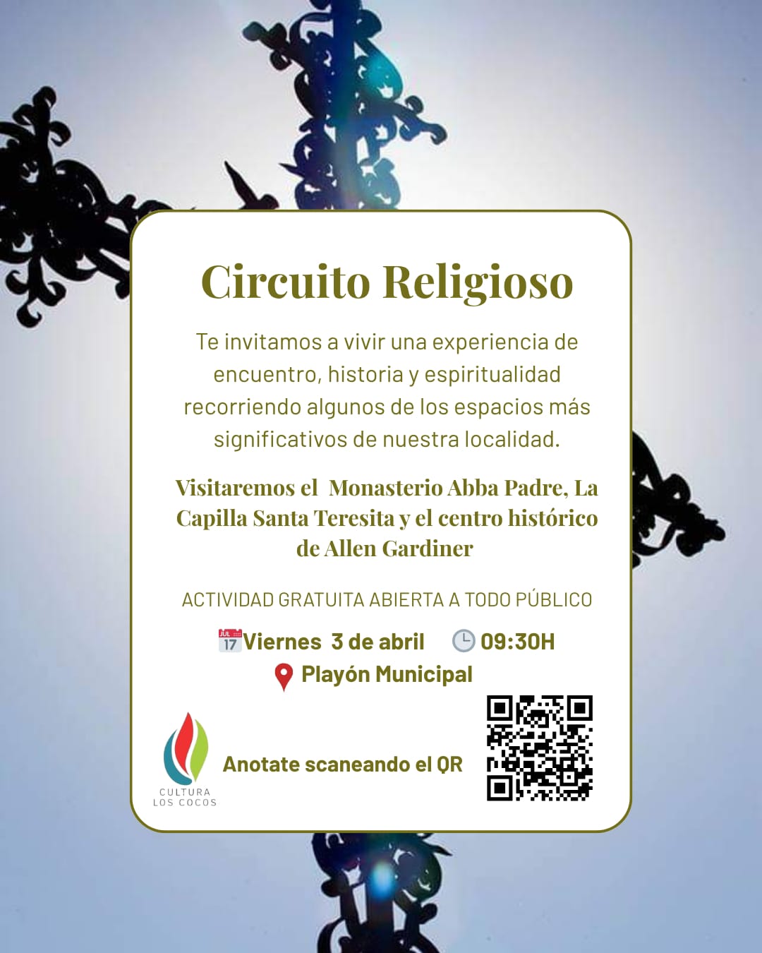 Circuito Religioso en Los Cocos Te invitamos a ser parte de un encuentro especial, caminando juntos por la Capilla Santa Teresita, Centro de Allen Gardiner y el Monasterio Abba Padre.Una caminata, entre historia, fe y paisajes.Actividad gratuita para todo público3 de abril9:30hPlayón Municipal Los CocosInscribite escaneando el QR o ingresando AQUI Fecha 03 Abr 2026 FINALIZADO Hora 09:30 Lugar Playón municipal Categoría Evento religioso Organizador Cultura Los Cocos Compartir este evento